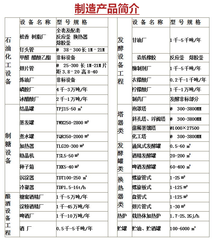 設(shè)備制造:承接糖廠、釀酒廠、酒精廠、啤酒廠、松香樹脂廠、石油化工、制藥、環(huán)保、輕工等廠家所需單臺配套設(shè)備或全套流程生產(chǎn)線工程設(shè)備!本公司提供現(xiàn)場施工及工廠制造、技術(shù)開發(fā)業(yè)務(wù)。所生產(chǎn)的設(shè)備指標(biāo)符合國家執(zhí)行的《國家標(biāo)準(zhǔn)》《行業(yè)標(biāo)準(zhǔn)》中規(guī)定的《鋼制壓力容器》《鋼制焊接常壓容器》《鋼制化工容器制造技術(shù)要求》《酒精蒸餾塔》《塔盤技術(shù)條件》《鋼制板式換熱器》《鋼制管殼式換熱器》《立式圓筒形鋼制焊接儲罐施工及驗收規(guī)范》等技術(shù)國標(biāo)標(biāo)準(zhǔn)。